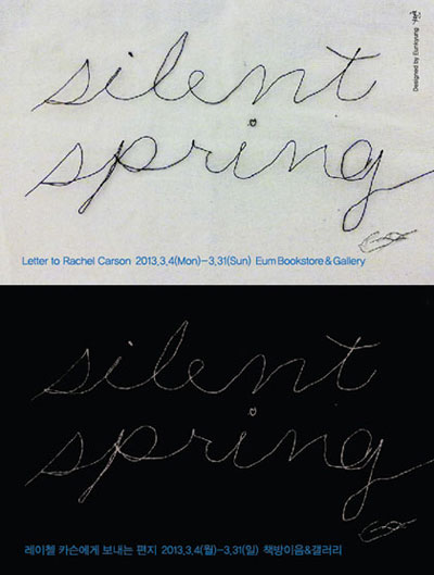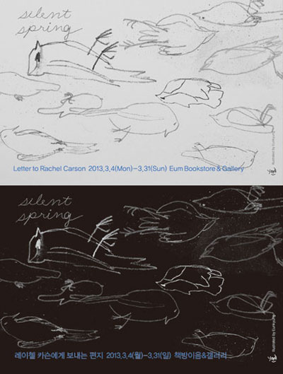 50주년이 지난 새 봄에 레이첼 카슨과 '침묵의 봄'을 기리는 전시를 여는 것이 의미가 있겠다는 윤호섭 선생님의 말씀을 따라 2013년 3월 서울 대학로의 이음책방 갤러리에서 '레이첼 카슨에게 보내는 편지'라는 타이틀로 첫 개인전을 열었습니다.
