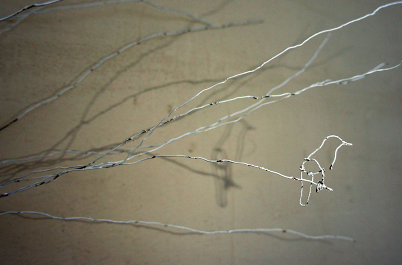 I visualized the round portion of spiral-binding as the leg of a bird that grasped branch, sitting. I immediately started to disassemble the calendar but left the last portion this time, straight rest of winding wire, made a bird shape that's sitting on a branch. I made several more, titled them 'Silent Spring'.